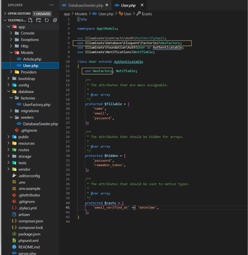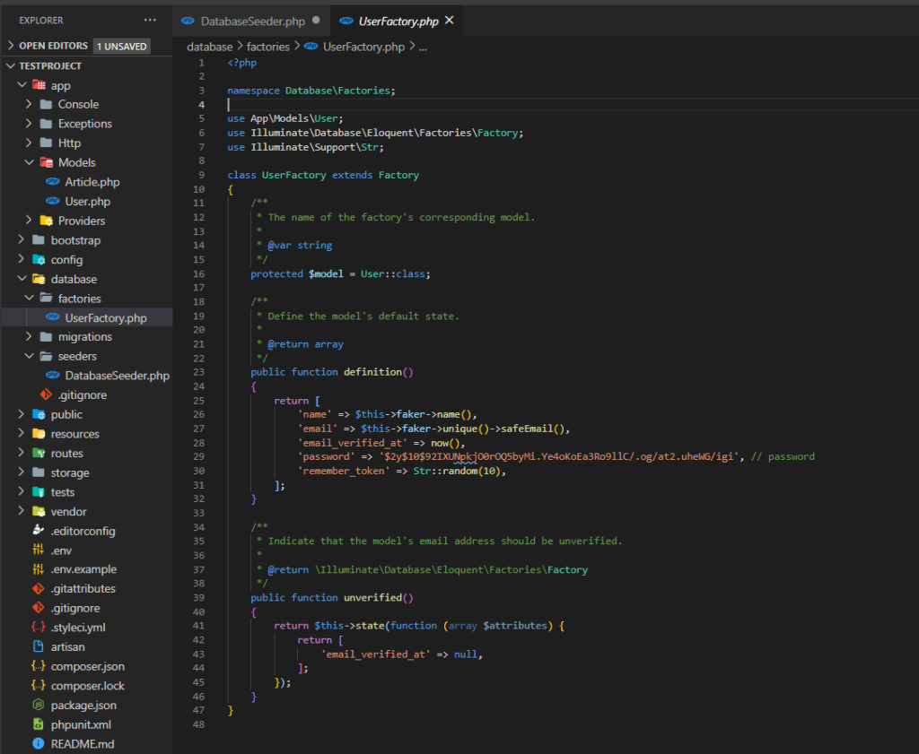 Por defeito o Laravel 8 cria para nós a classe UserFactory que podemos encontrar em database/factories que tem o seguinte código: