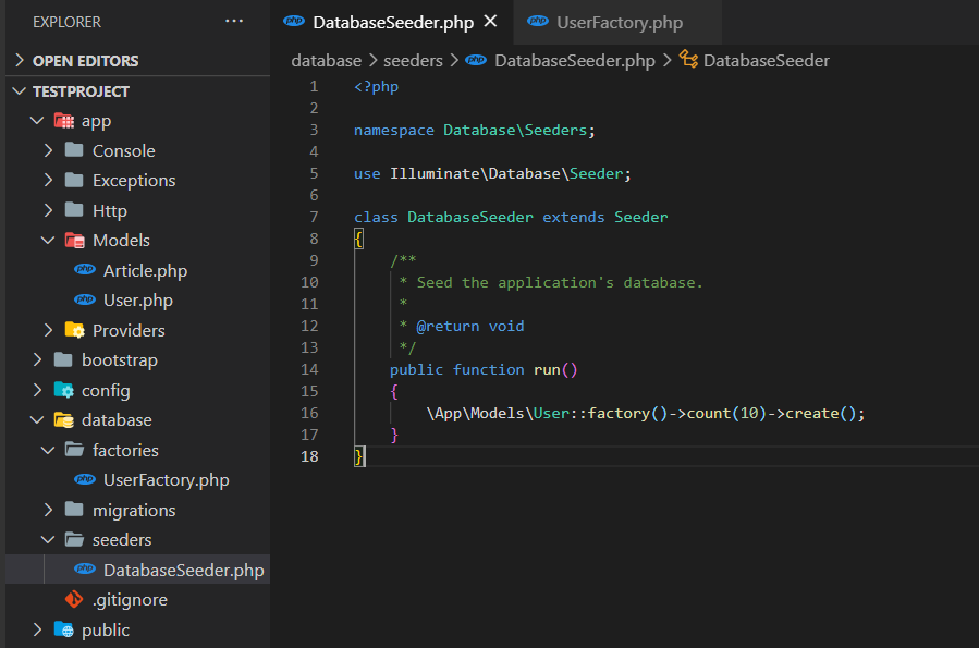 De seguida vamos à classe DatabaseSeeder e escrevemos o seguinte código:
